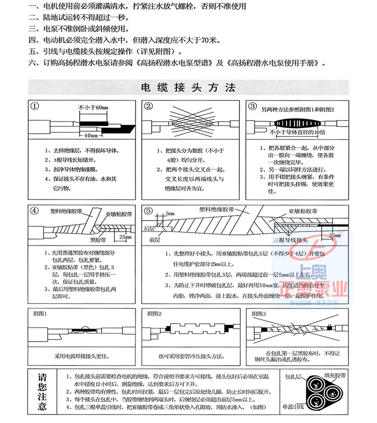 5、潛水電機(jī)采用水潤(rùn)滑軸承,下部裝有橡膠調(diào)壓膜、調(diào)壓彈簧,組成調(diào)壓室,調(diào)節(jié)由于溫度引起的 壓力變化;電機(jī)繞組采用聚乙稀絕緣,尼龍護(hù)套耐用消費(fèi)品水電磁線(xiàn),電纜聯(lián)接方式按QJ型電纜接頭工藝,把接頭絕緣脫去刮凈漆層,分別接好,焊接牢固,用生橡膠繞一層。再用防水粘膠帶纏2~3層,外面包上2~3層防水膠布或用水膠粘結(jié)包一層橡膠帶(自行車(chē)?yán)飵В┮苑罎B水。