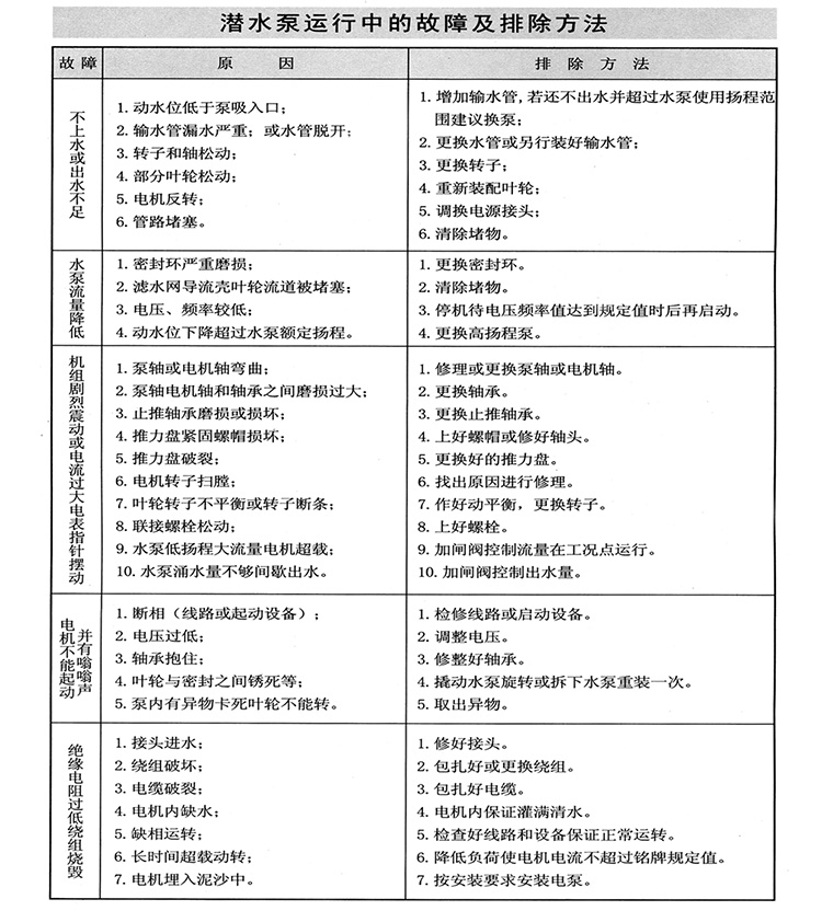 九、QJ型潛水深井泵常見(jiàn)故障及排除方法