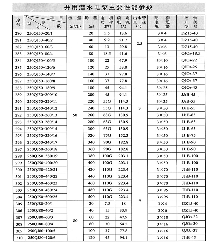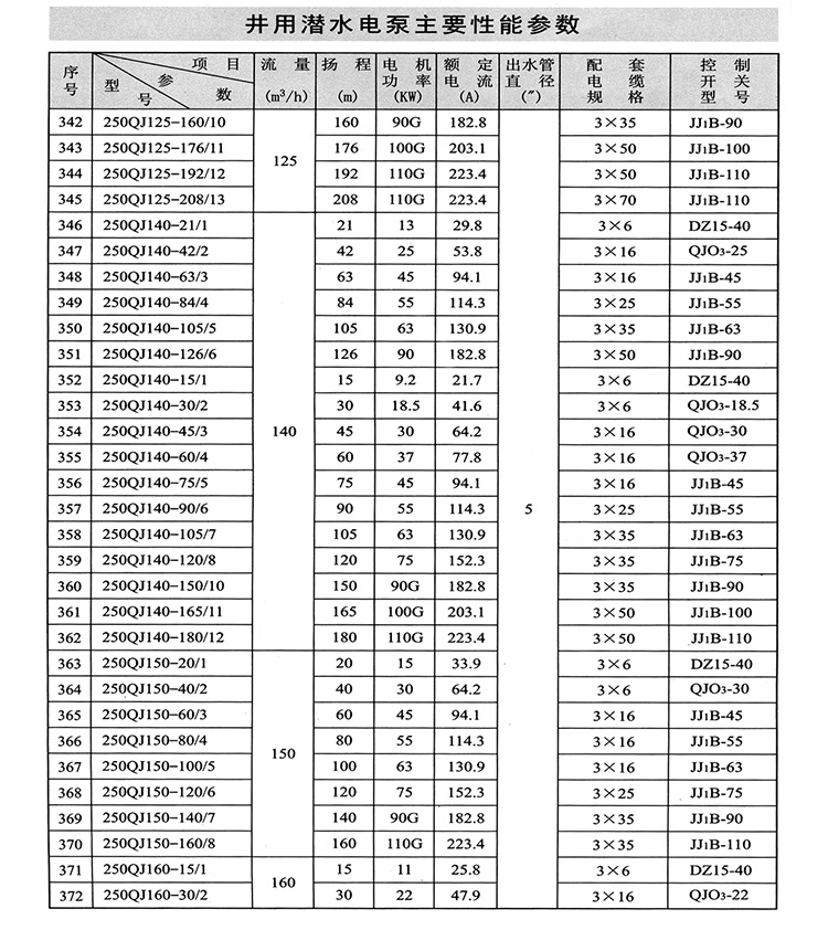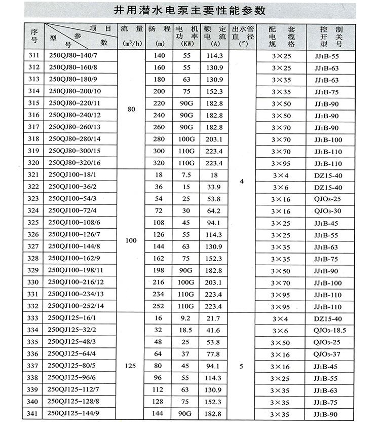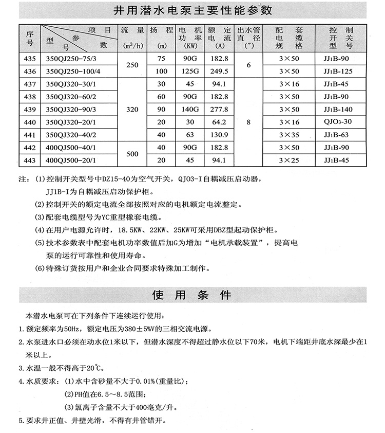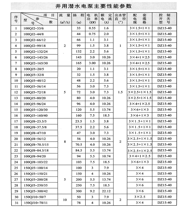 1、QJ型潛水深井泵由:水泵、潛水電機(包括電纜)、輸水管和控制開關四大部分組成。潛水泵為單吸多級立式離心泵:潛水電機為密閉充水濕式、立式三相籠異步電動機,電機與水泵通過爪式或單健筒式聯(lián)軸器直接;配備有不同規(guī)格的三芯電纜;起動設備為不同容量等級的空氣開關和自偶減壓起動器、輸水管為不同直徑的鋼管制成、采用法蘭聯(lián)接,高揚程式電泵采用閘閥控制。