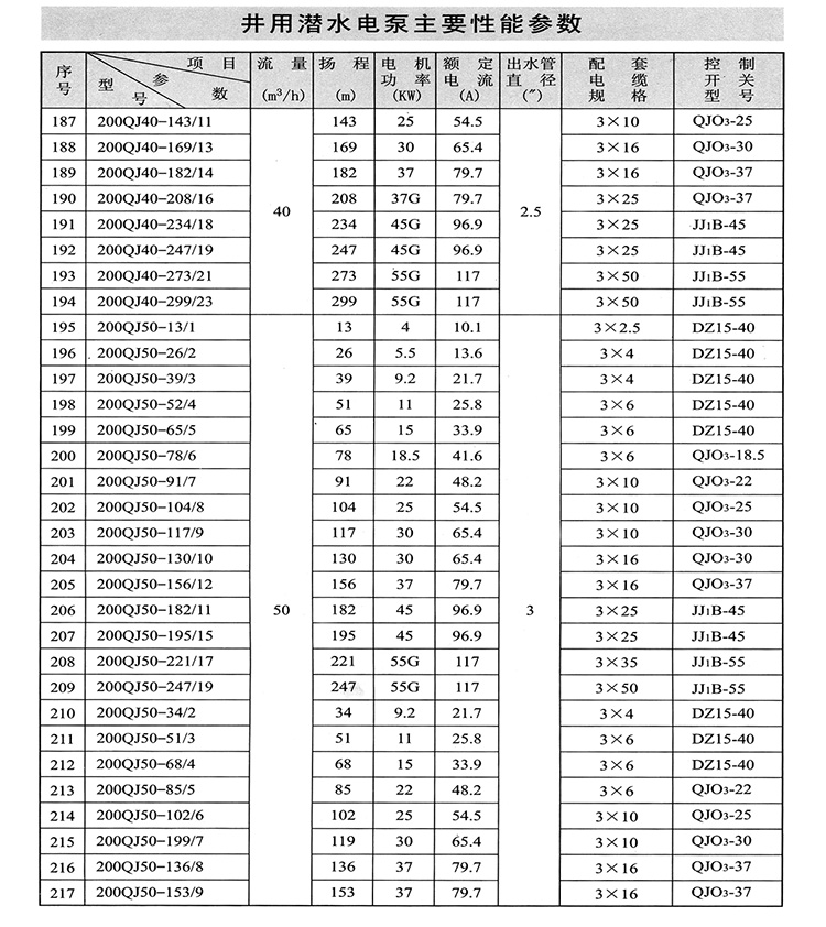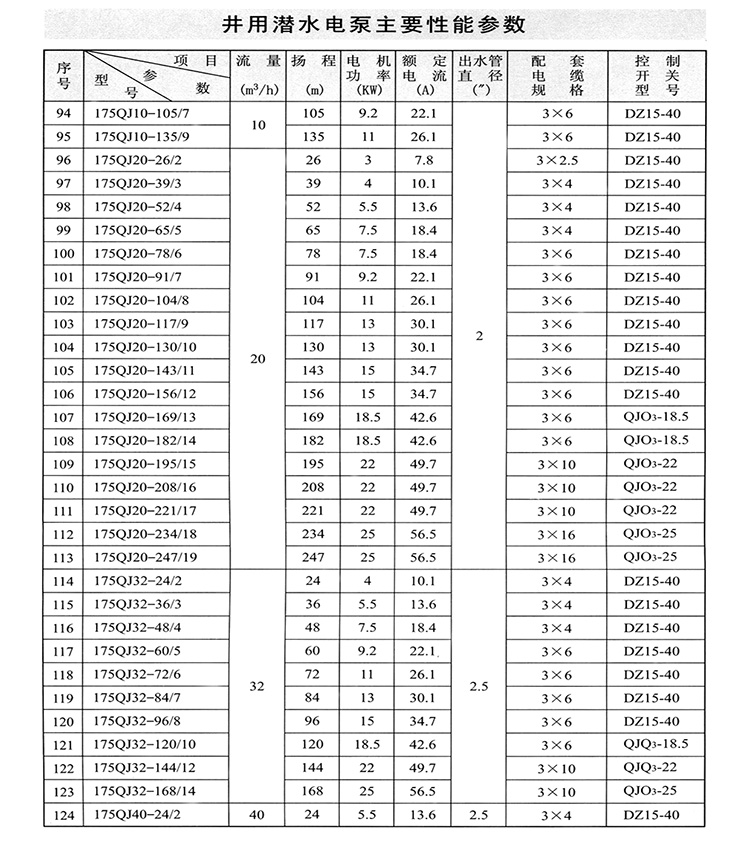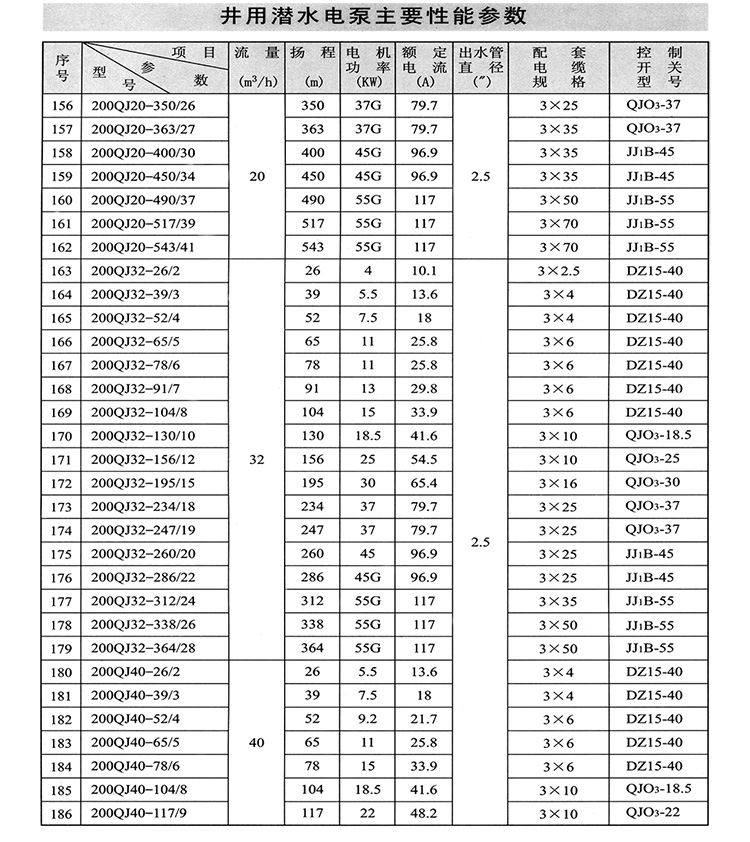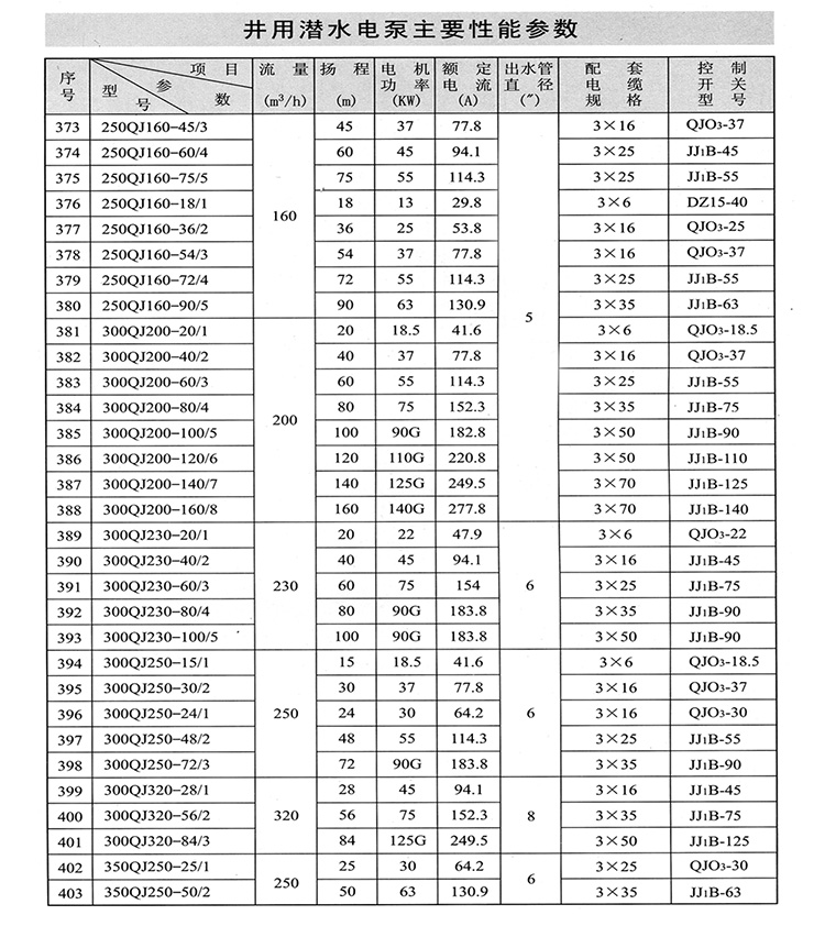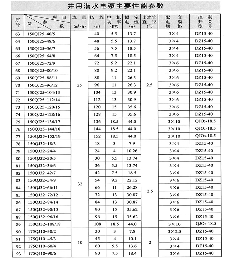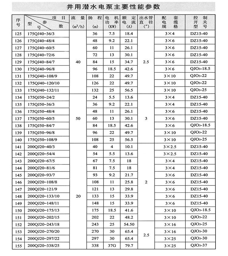 1、QJ型潛水深井泵由:水泵、潛水電機(包括電纜)、輸水管和控制開關四大部分組成。潛水泵為單吸多級立式離心泵:潛水電機為密閉充水濕式、立式三相籠異步電動機,電機與水泵通過爪式或單健筒式聯(lián)軸器直接;配備有不同規(guī)格的三芯電纜;起動設備為不同容量等級的空氣開關和自偶減壓起動器、輸水管為不同直徑的鋼管制成、采用法蘭聯(lián)接,高揚程式電泵采用閘閥控制。