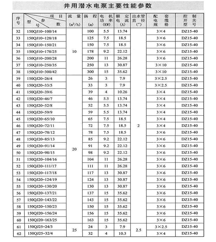 150QJ深井泵主要用于深井提水、增壓,它廣泛適用于農(nóng)田灌溉、城鄉(xiāng)生活區(qū)、工礦企業(yè)給排水、建筑工程降水、河流、水庫、噴泉、制冷系統(tǒng)、溫泉浴場、綠化等各種水利工程設施。其主要特點是電機和水泵連為一體潛入水中工作,具有使用、安裝、維護方便、根據(jù)不同要求,可提供不銹鋼鑄造、不銹鋼沖壓焊接、鑄銅、鑄鐵等不同材質(zhì)。該水泵對外徑具有嚴格限制,為水潤滑,不會出現(xiàn)電機密封泄露,污染水源的情況。