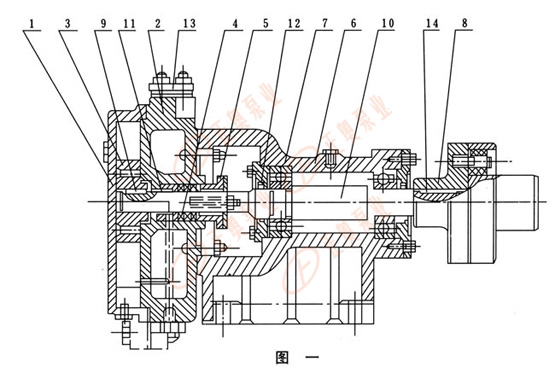 由鑄鐵制成葉輪(3),有l(wèi)2個(gè)葉片呈放射狀均分布,有平衡孔(其中兩個(gè)套扣供拆卸用)平軸向力。口十輪平鍵(9)與軸(10)聯(lián)接并可沿軸向滑動(dòng)調(diào)節(jié)間隙。軸為優(yōu)質(zhì)鋼制成,支承在泵的托架(6)內(nèi)的兩個(gè)滾珠軸承(17)上右端有彈性聯(lián)軸器(8)和電機(jī)直接聯(lián)接。托架(6)用鑄鐵制成,有止口保證與泵體準(zhǔn)確聯(lián)接,軸承間有空腔,可存潤(rùn)滑油,用稀油或黃油滑均可。