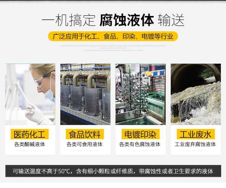 塑料泵廣泛應用于化工、食品、釀造、制藥、電鍍、造紙、環(huán)保、水 處理等部門,輸送酸、堿、鹽等腐蝕性液體。