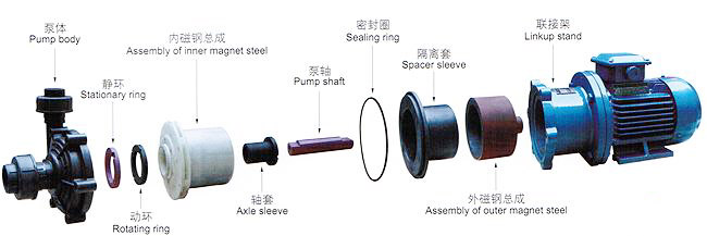 磁力泵以靜密封取代動(dòng)密封,使泵的過流部件處于完全密封狀態(tài),徹底解決了其它泵的機(jī)械密封無法避免的跑,冒,滴之蔽病,磁力泵選用耐腐蝕,鋼玉陶磁,增強(qiáng)聚丙稀作為制造材料,因此它具有良好的抗腐蝕性能,并可以使實(shí)輸送介質(zhì)免受污染。
