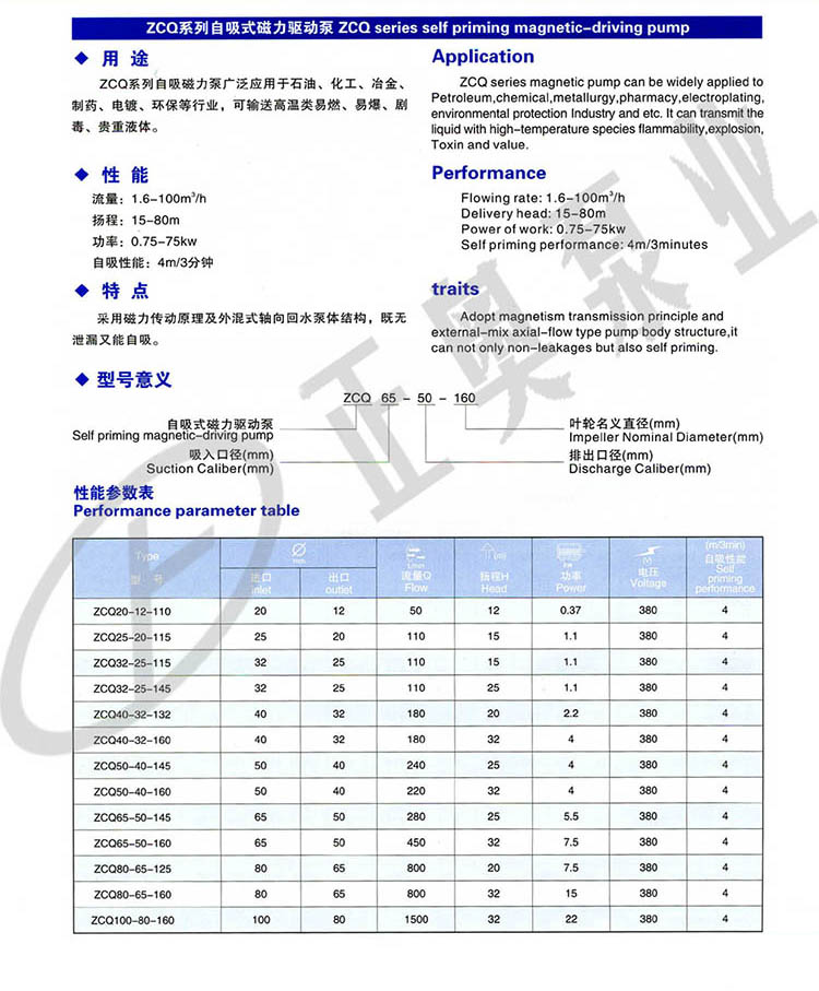ZCQ型自吸式磁力泵性能參數(shù)表