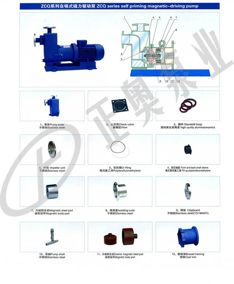 ZCQ系列自吸式磁力泵(以下簡(jiǎn)稱自吸泵)是根據(jù)眾用戶的要求,該泵以靜密封取代動(dòng)密封,使泵的過流部件處于完全密封狀態(tài),解決了其它泵機(jī)械密封無法避免的跑、冒、滴、漏之弊病,泵體及過流部件的材料均采用了耐腐蝕的不銹鋼、鋼玉陶瓷、四氟石器等材料制造,即有CQ型磁力驅(qū)動(dòng)泵的功能,又集自吸于一身,不需底閥和引灌水、自吸高度4米。