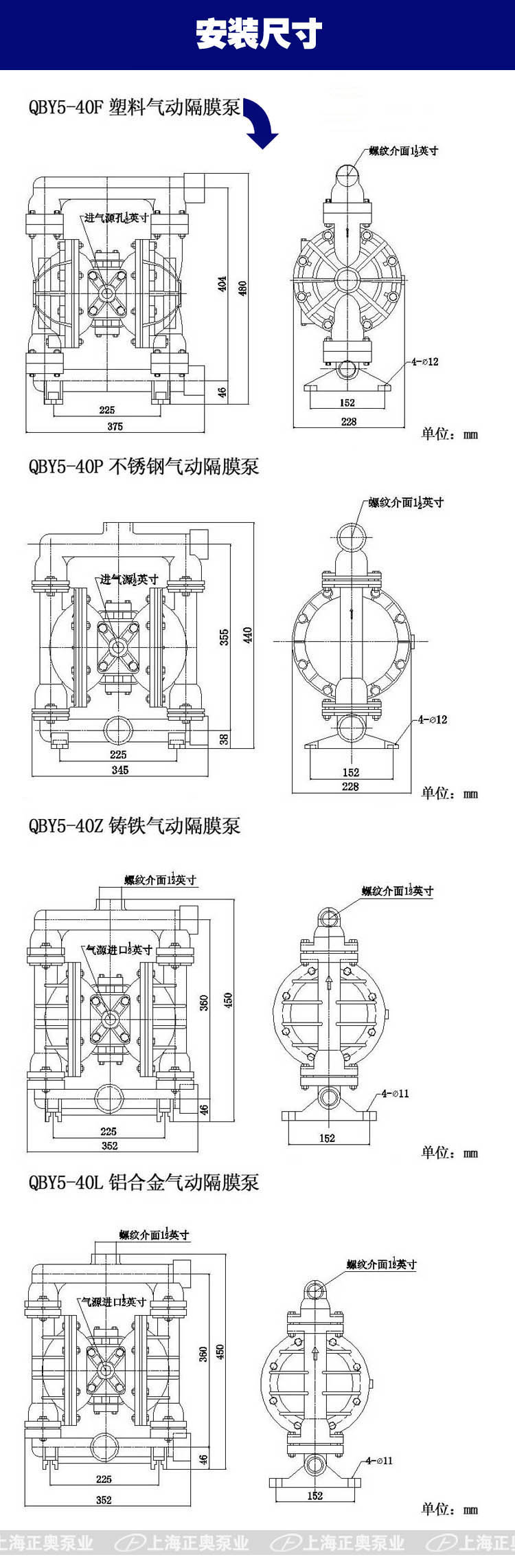 正奧公司生產(chǎn)的隔膜泵共有十二種規(guī)格。進(jìn)出口尺寸分別為1/4”(10mm)、1/2”(15mm)、3/4”(20mm)、1”(25mm)、1.2”(32mm)1.5”(40mm)、2”(50mm)、2.5”(65mm)3”(80mm)、4”(100mm)流體部件材質(zhì)有:鋁合金、鑄鐵、工程塑料、不銹鋼、隔膜片根據(jù)不同膜片材質(zhì)分別有:丁晴橡膠、氯丁橡膠、聚乙烯、聚膠、聚醚橡膠、氟橡膠、氟塑料、特氟隆。以滿足不同液體介質(zhì)的需要。