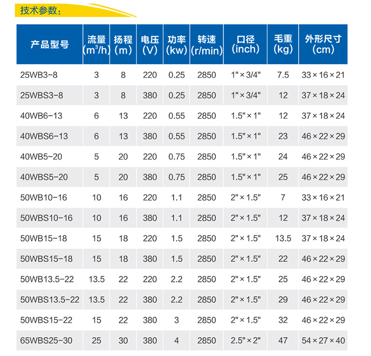 產(chǎn)品型號(hào) 最大流量(m3/h) 最高揚(yáng)程(m) 額定功率(kW) 電壓(V) 口徑(mm) 毛重(kg) 包裝尺寸(cm3)