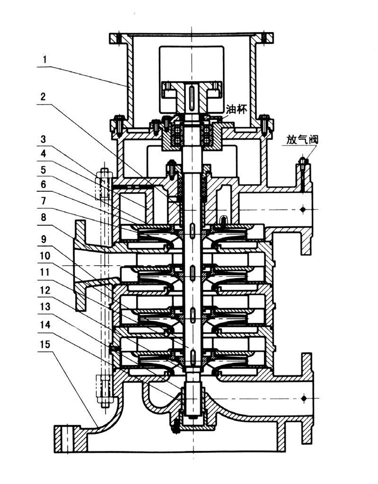 DL立式多級離心泵為立式多級多節(jié)段式結(jié)構(gòu)。螺桿把進水段、中段、出水段夾緊聯(lián)成一體。水泵每一級 裝一個葉輪、一個導(dǎo)水葉。軸向力采用水力平衡法解決,殘余軸向力由球軸軸承承受,用油脂潤滑。軸封采用軟填料或機械密封。產(chǎn)品執(zhí)行JB/T2727-93 《立式多級離心泵型式與基本參數(shù)》標(biāo)準(zhǔn),主要供吸送稀釋的、清潔的、不腐蝕的、不爆炸的清水及物理化學(xué)性質(zhì)類似水的不含固體顆;蚶w維的液體。